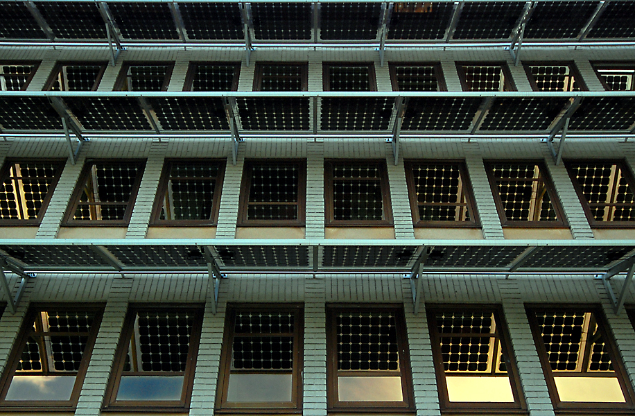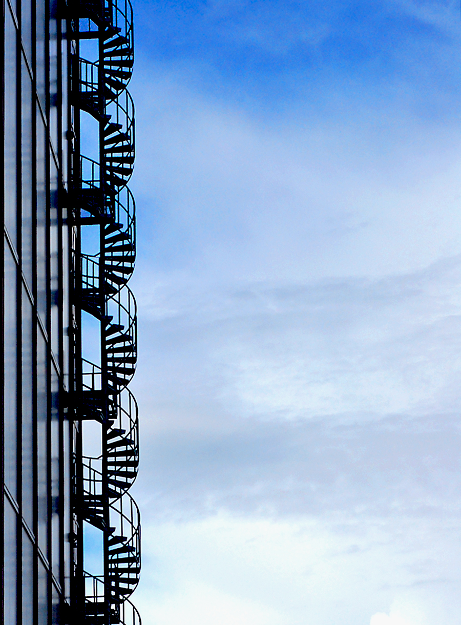 Den översta bilden är kommunhuset i Karlstad och deras solskydd och solceller som reflekterar sig snyggt i fönstrens spegelglas, och nedersta bilden är löfbergsskrapans spiraltrappa som slingrar sig snyggt längs huskroppen.