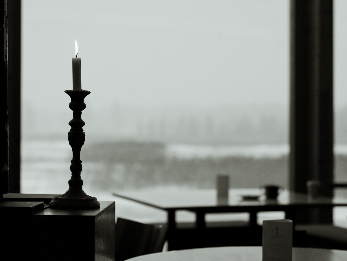 Översta bilden ska förmedela hur stearinljuset på cafét sprider värme och omtanke till sina besökare. Utanför är det full snöstorm och oväder, det är mysigt att vara inne i stugvärmen nu.