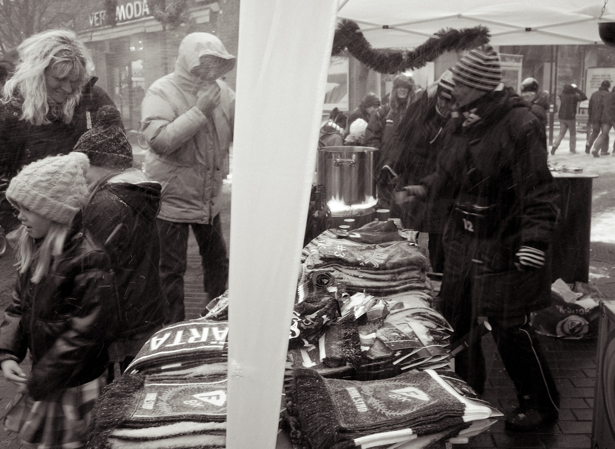 Under dagens skyltsöndag så delade vänliga människor ut varm glögg gratis i snöstormen och kylan. En handling som värmde på flera sätt.