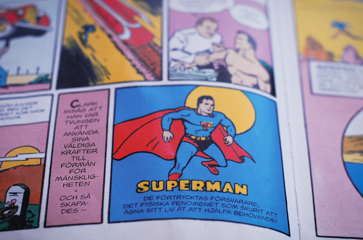 På biblioteket hittade jag en samlingpärm med den första tidningsupplagan där Superman skapas. Därför kallar jag också bilden ”…och så skapades Superman”.