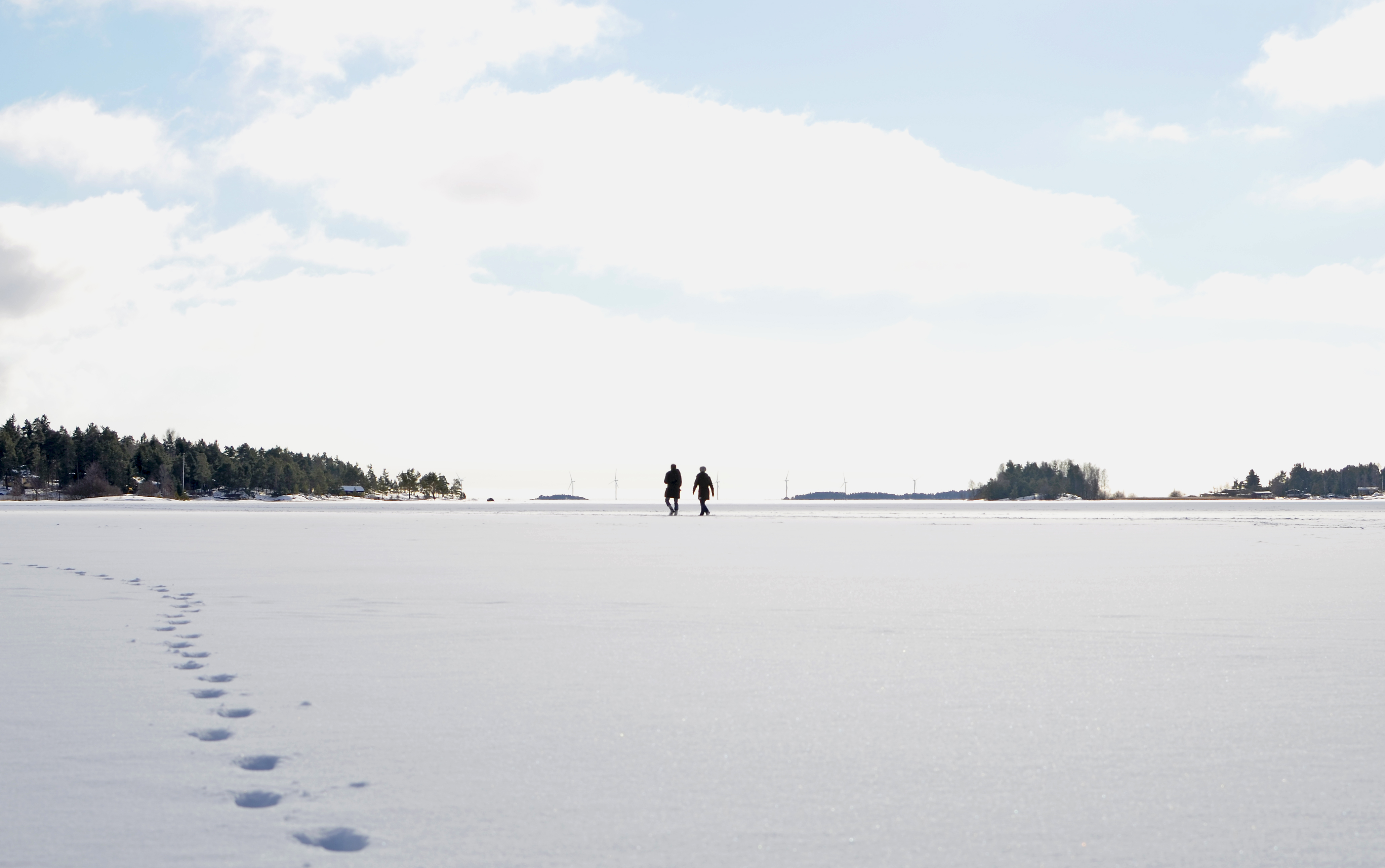 En man och kivnna som är ute på söndagspromenad passerar oss och fortsätter på isen i det fina solskenet.