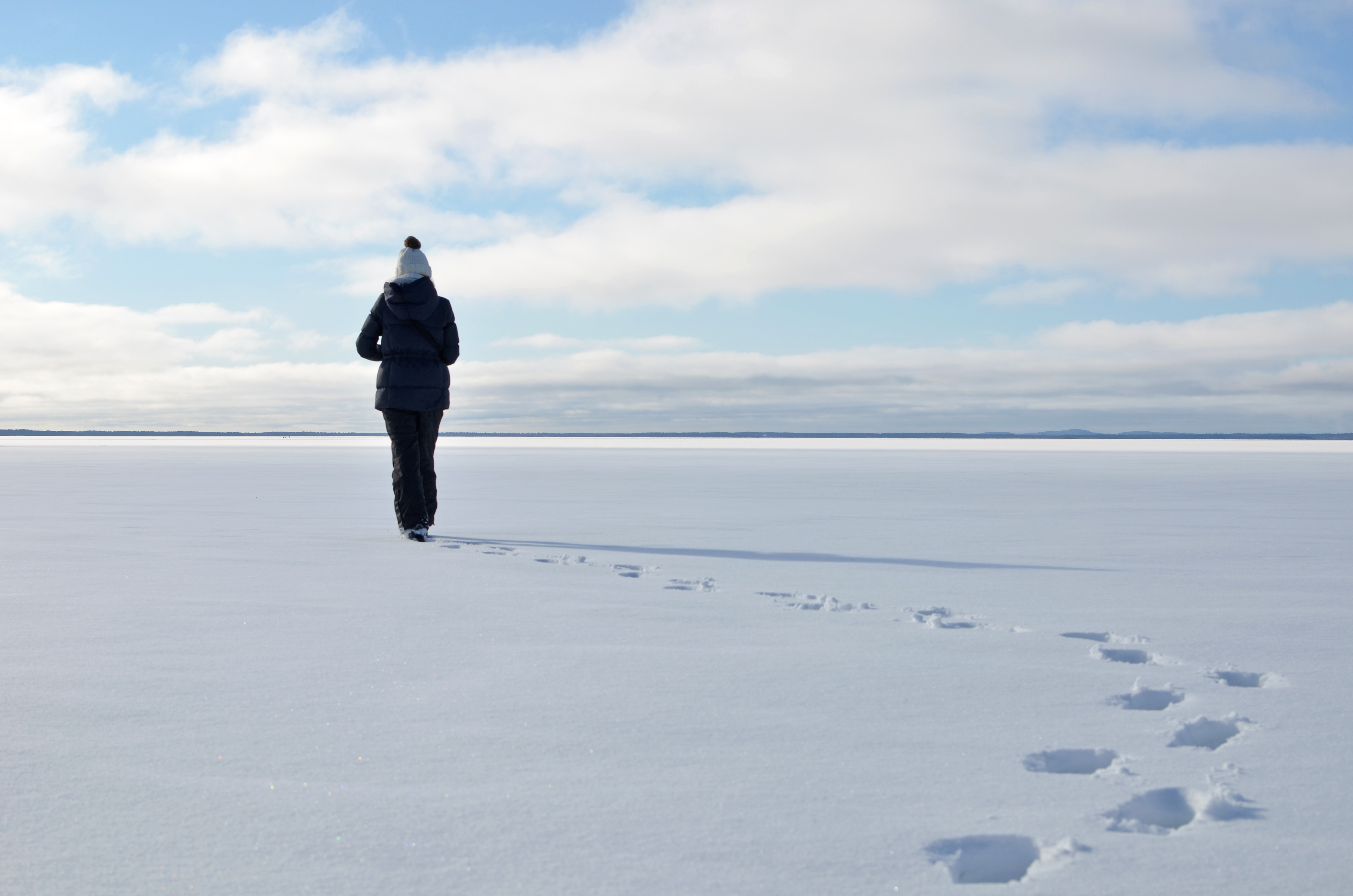 Framför oss ligger ett orört vinterlandskap när vi tittar ut över isen bort mot horisonten.