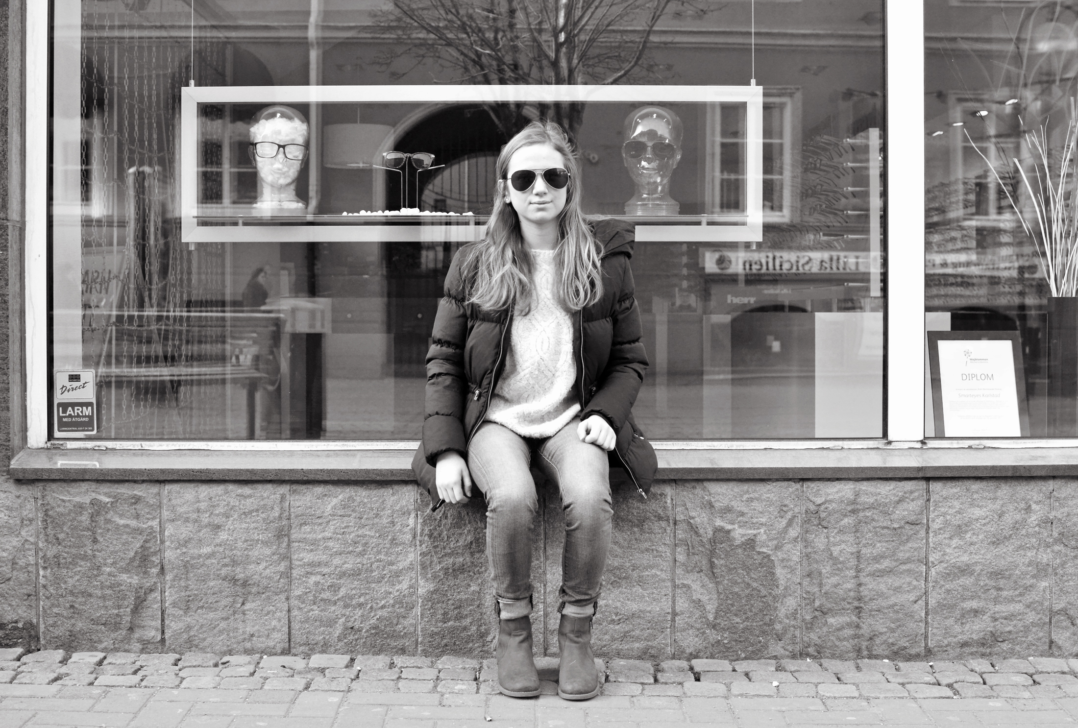 På kanten utanför skyltfönstret hos en optiker i stan, sitter en ung tjej med solglasögon och njuter av det fina vårvädret som den här söndagen bjuder på.
