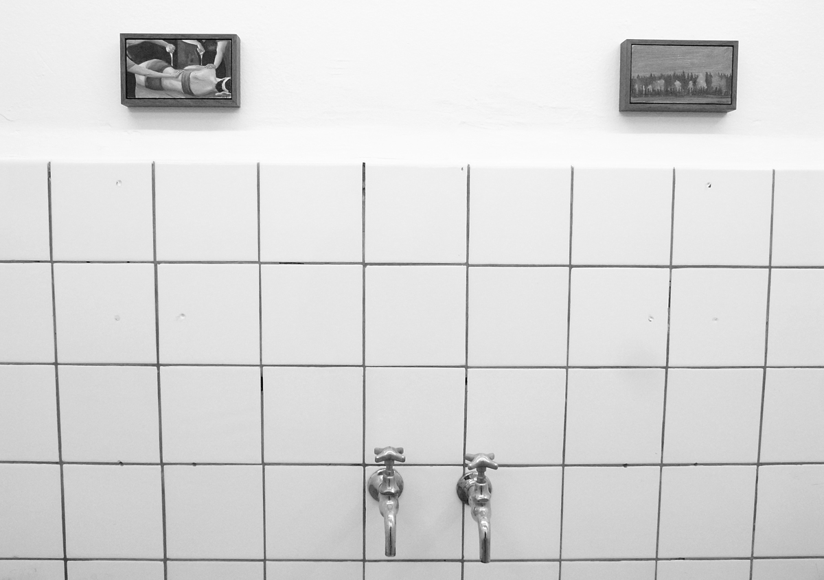 Även i det gamla duschrummet hittar vi tavlor på väggarna.