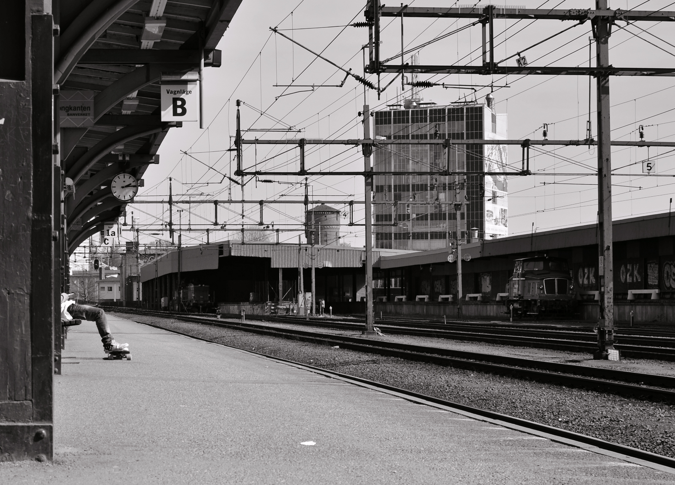 Perrongen är folktom och lite öde, men så ser jag att det sitter en ensam ung man på en bänk med fötterna på sin skateboard och ett par hörlurar i öronen.