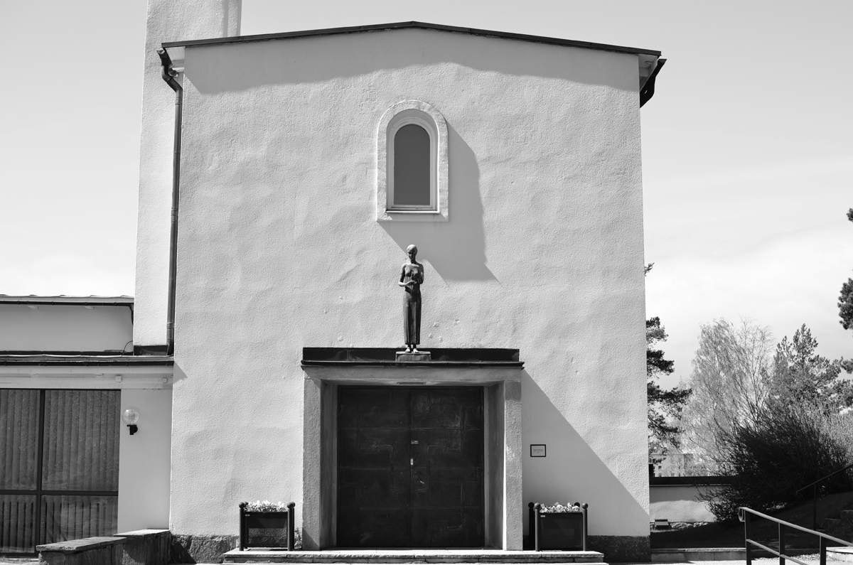 Flickan står på Ruds Kyrkogård ovanför entrén till Uppståndelsens kapell och är gjord av skulptören och konstnären Arvid Knöppel 1892-1970.