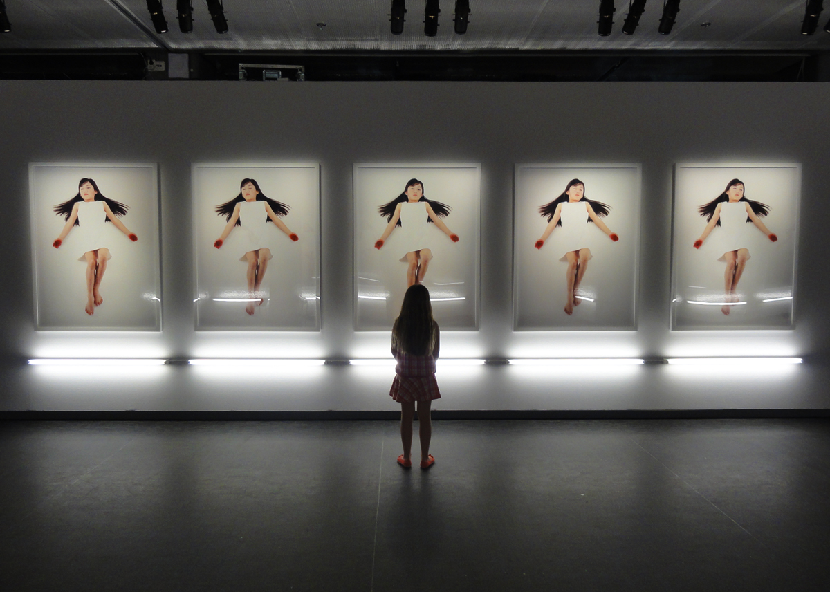 En liten flicka tittar på bilder av Motohiko Odani.