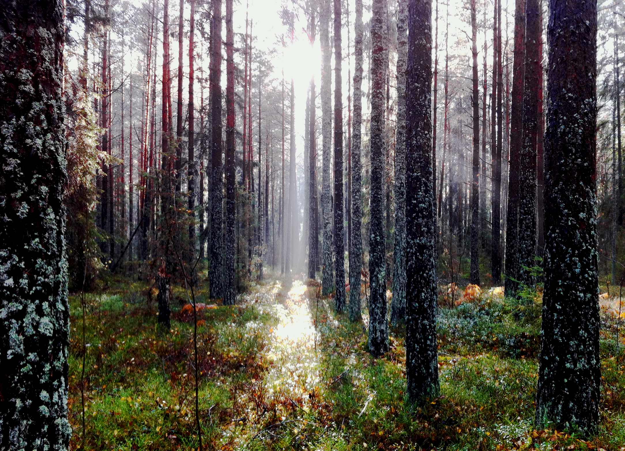 Plötsligt tränger solen bort molnen, bryter sig igenom trädtopparna och skapar en ljusgata i skogen, vinden tystnar och regndropparna hänger sig kvar i grenarna, bara för några få sekunder, sedan slocknar den och är borta.