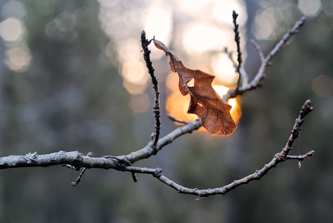 Ett sista löv hänger kvar i eken och vägrar släppa taget.