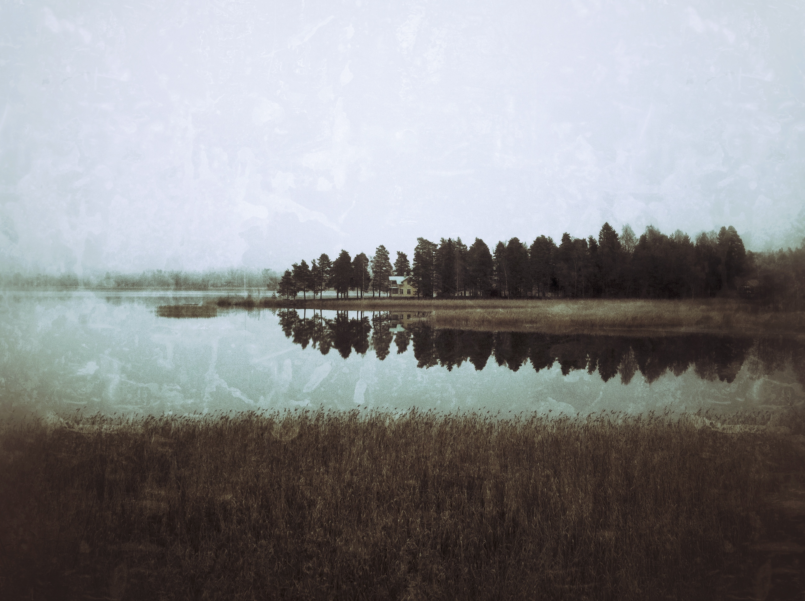 När jag åkte förbi häromdagen låg det en dimslöja över landskapet och sjön låg alldeles spegelblank.