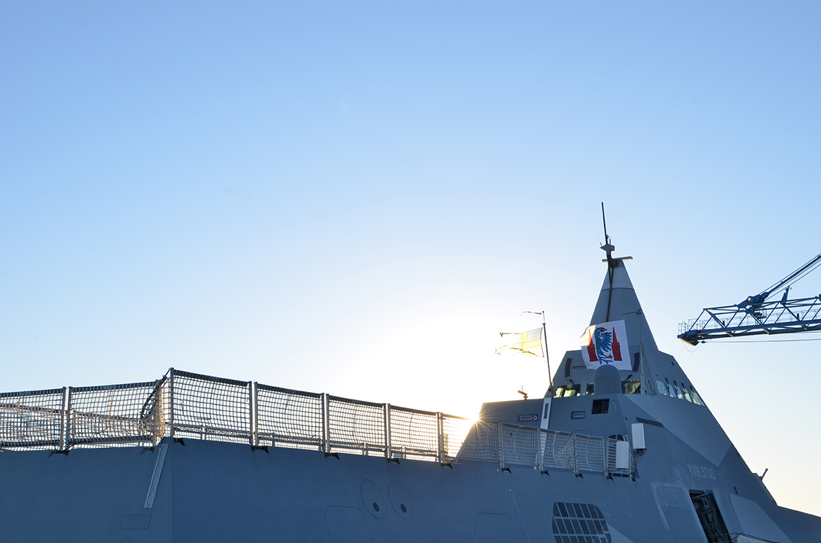 Så klart var jag tvungen att åka ner till hamnen och kolla in det coola fartyget som är byggt med stealthteknik och därför också med ett unikt och speciellt utseende utan räta vinklar, för att försvåra att upptäckas på radarn.
