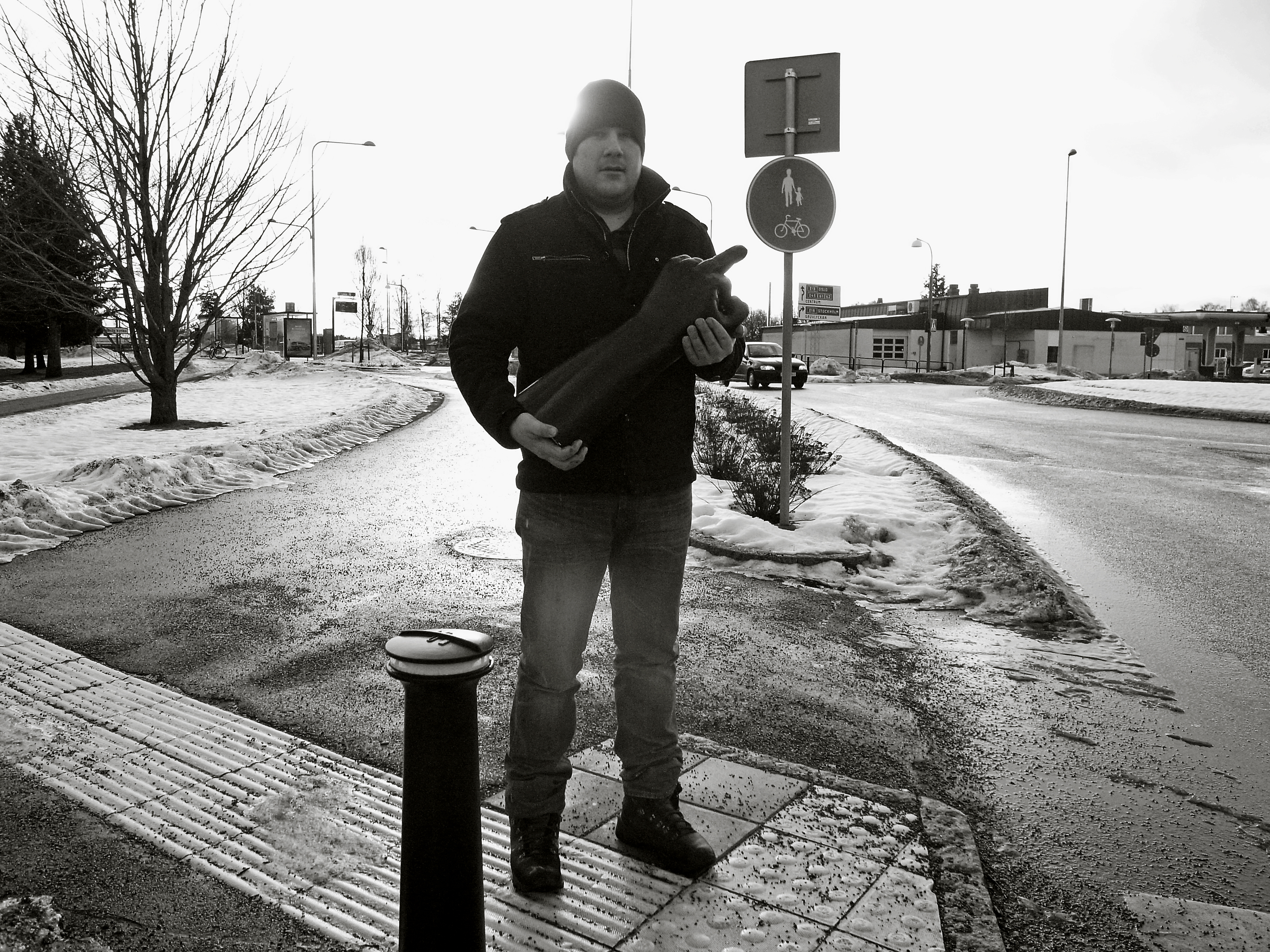 Min nyfikenheten är för stor för att inte ta reda på saken, så direkt när jag släppt av dottern vid sin träning, kör jag tillbaka och ser hur mannen svänger av och går över E18-bron mot Våxnäs centrum. Jag kör upp till kyrkan i närheten där jag ställer bilen och möter upp honom vid övergångstället, med kamera i min hand.