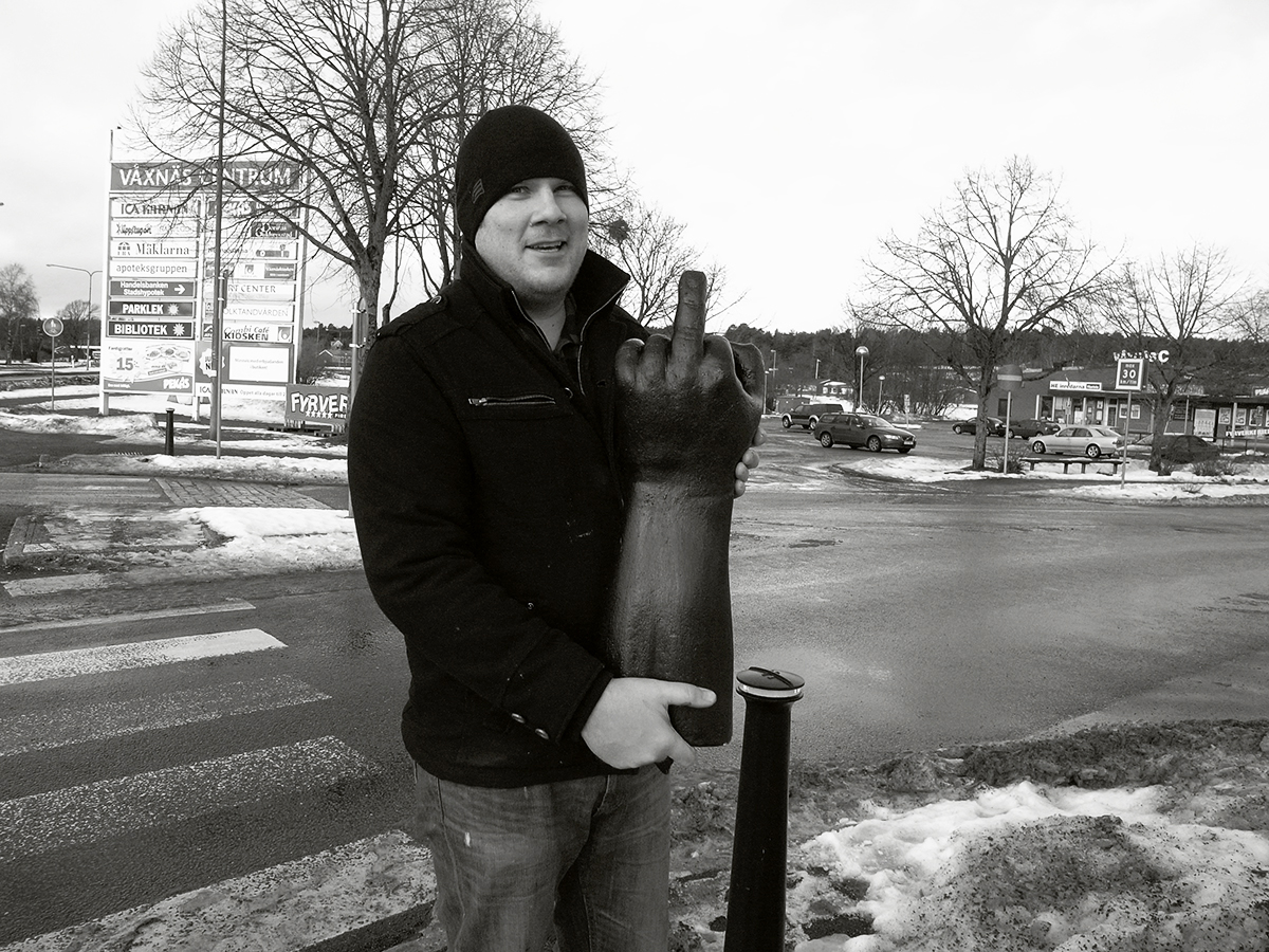 Vem är denna man som går runt med en stor underarm som visar ”Fuck Off”?