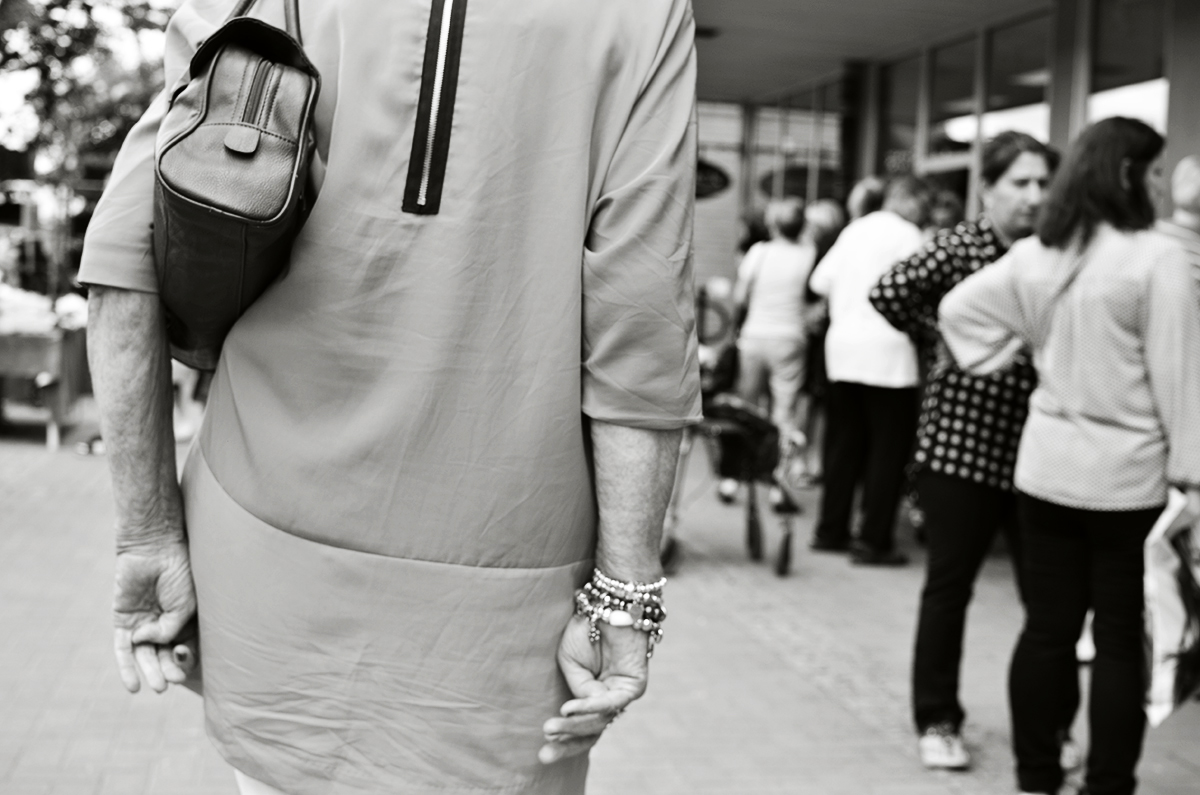 Finklädd och med accessoarer på marknad