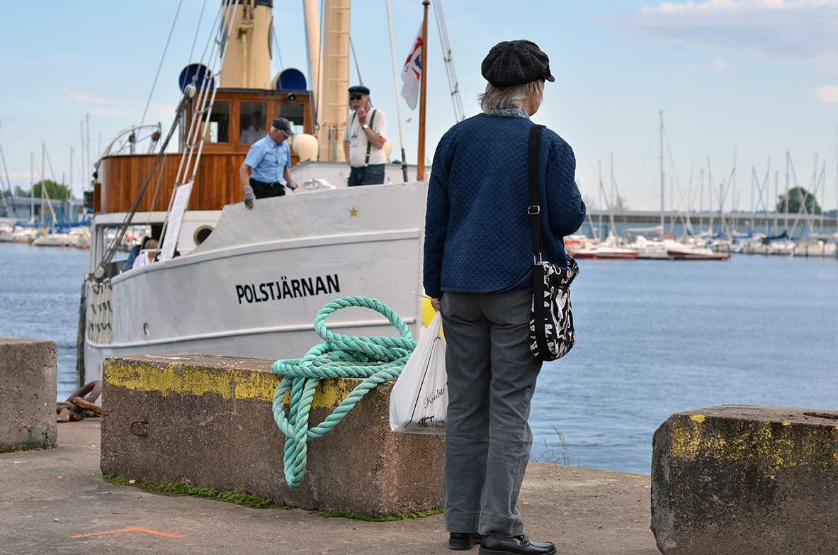 En ensam kvinna står vid kajen där ångbåten S/S Polstjärnan strax ska lägga till i Karlstads hamn.