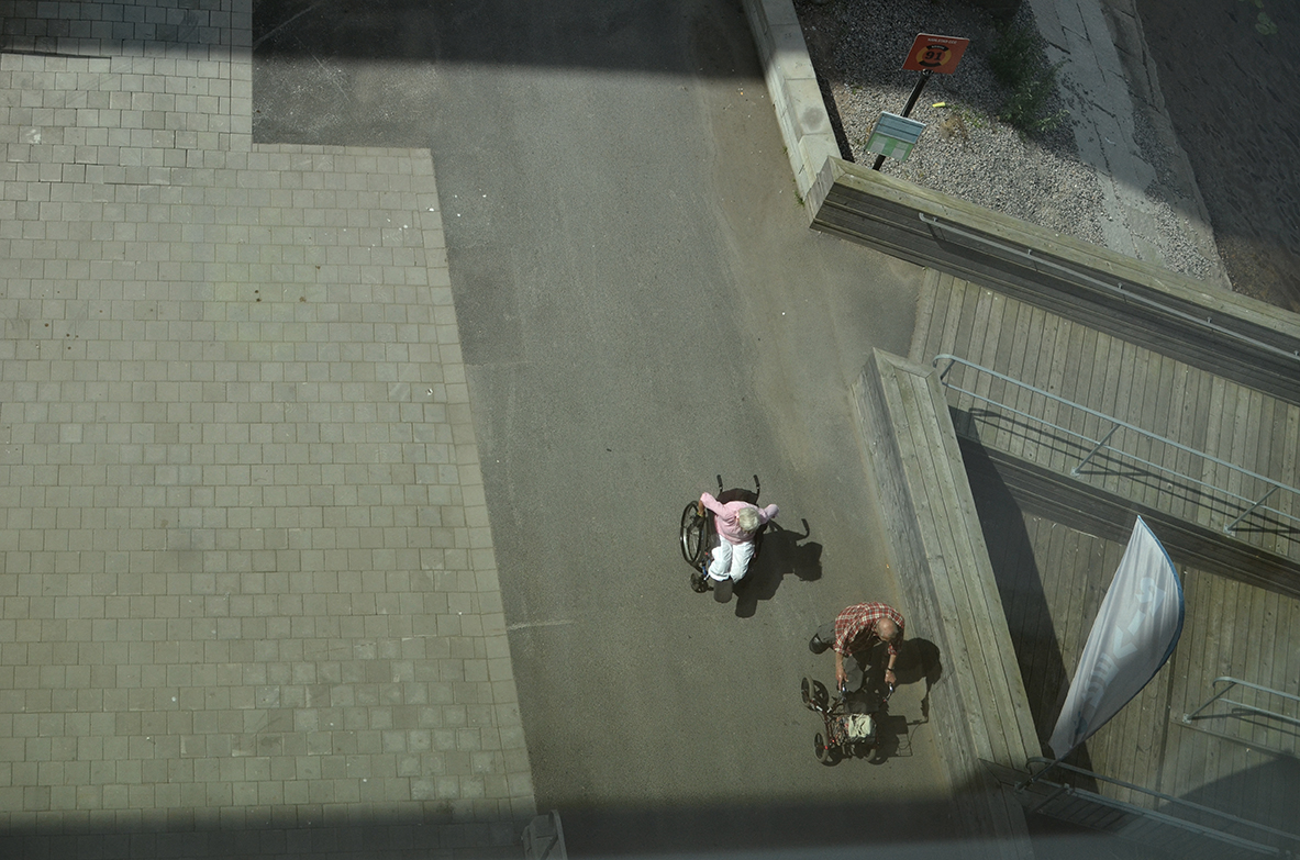 Precis då kommer ett äldre par nedanför mig, där kvinnan sitter i rullstol och mannen går med hjälp av en rullator. Hon kämpar med att hålla samma takt som mannen och de kommer ut i ett stråk där solljuset faller in mellan husen, passerar en hållplats och ett vägskäl där cykelvägen och bryggan korsar varandra.