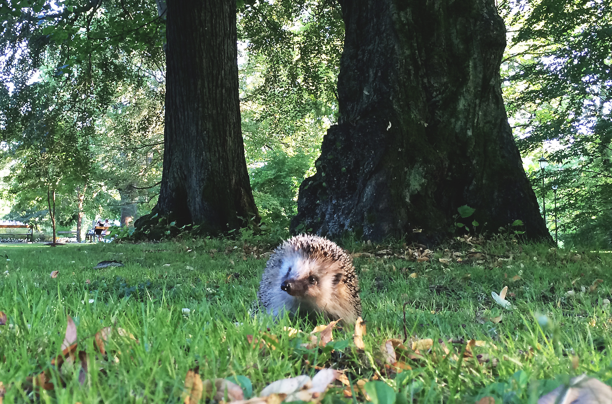 Vi gick närmare varandra och när jag kom lite för nära rullade den ihop sig till en boll och blåste upp sig. Jag satte mig ner några meter bort och efter en kort stund kikade nosen ut, tittade nyfiket på mig och promenerade vidare i parken.
