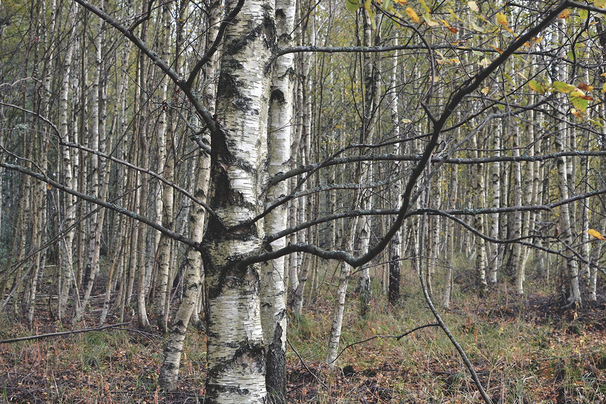 Jag står här i skogen, omgiven av alla dessa vackra björkar med sina svarta och vita stammar.