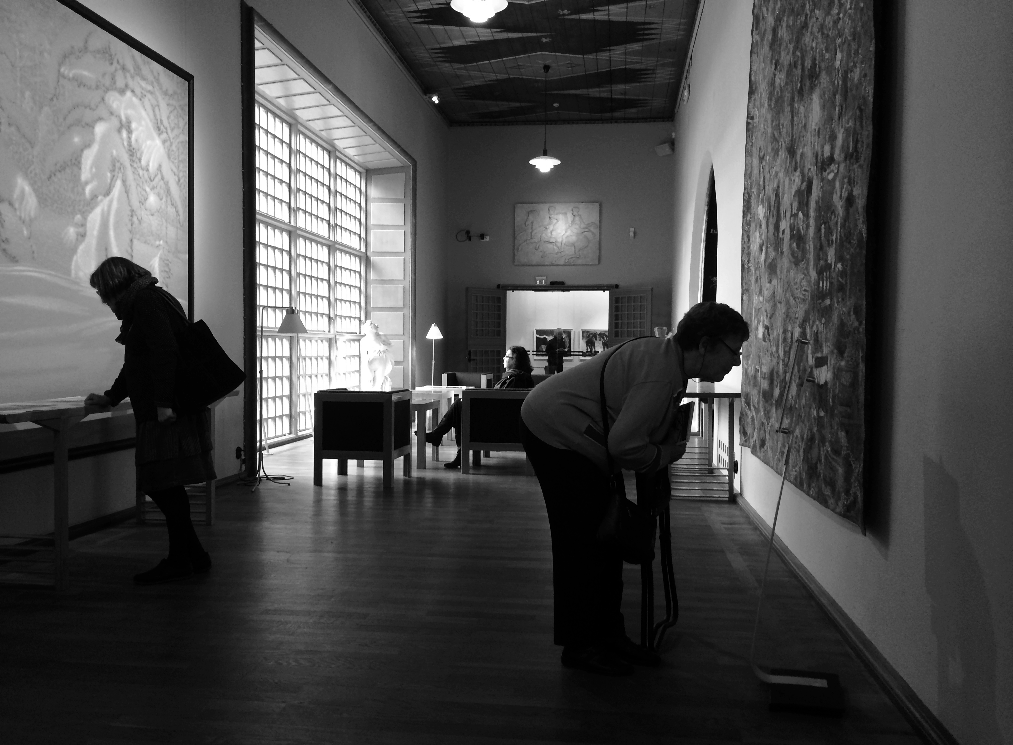 En kvinna står och läser om ett konstverk på Värmlands museum, en annan bakom henne och lite längre bort sitter en kvinna och läser, bilden är min symbol för att vi lär så länge vi lever.