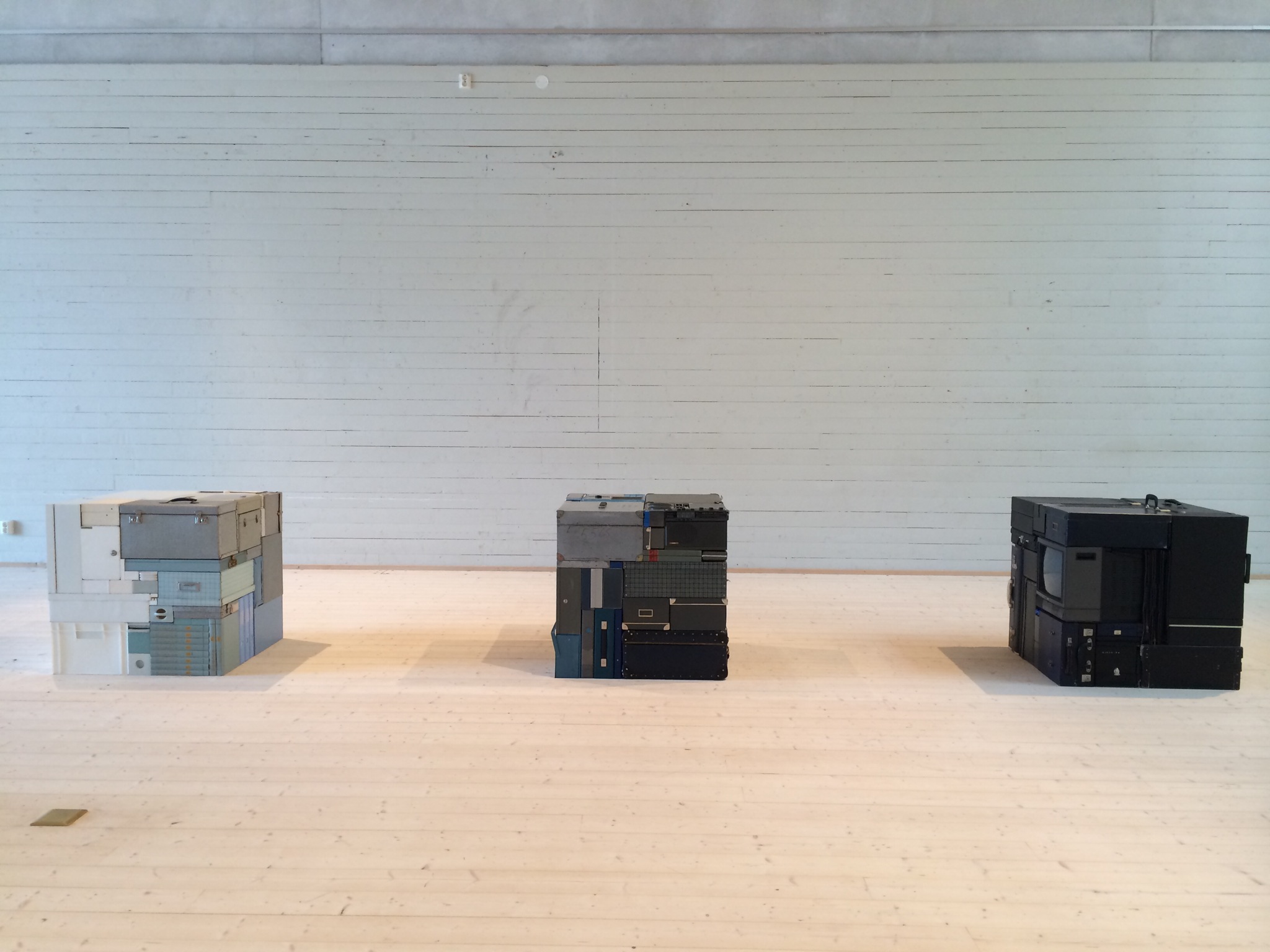 Det är många saker som jag tycker om med de här skulpturerna, där vardagliga föremål och möbler packats ihop i kuber.