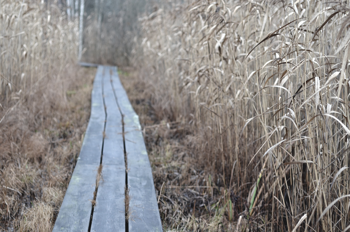På hala träspångar tar jag mig genom vassen, vattnet står högt efter allt novemberregn och på några ställen är det precis vi tar oss vidare när vattnet slickar stövelkanten.