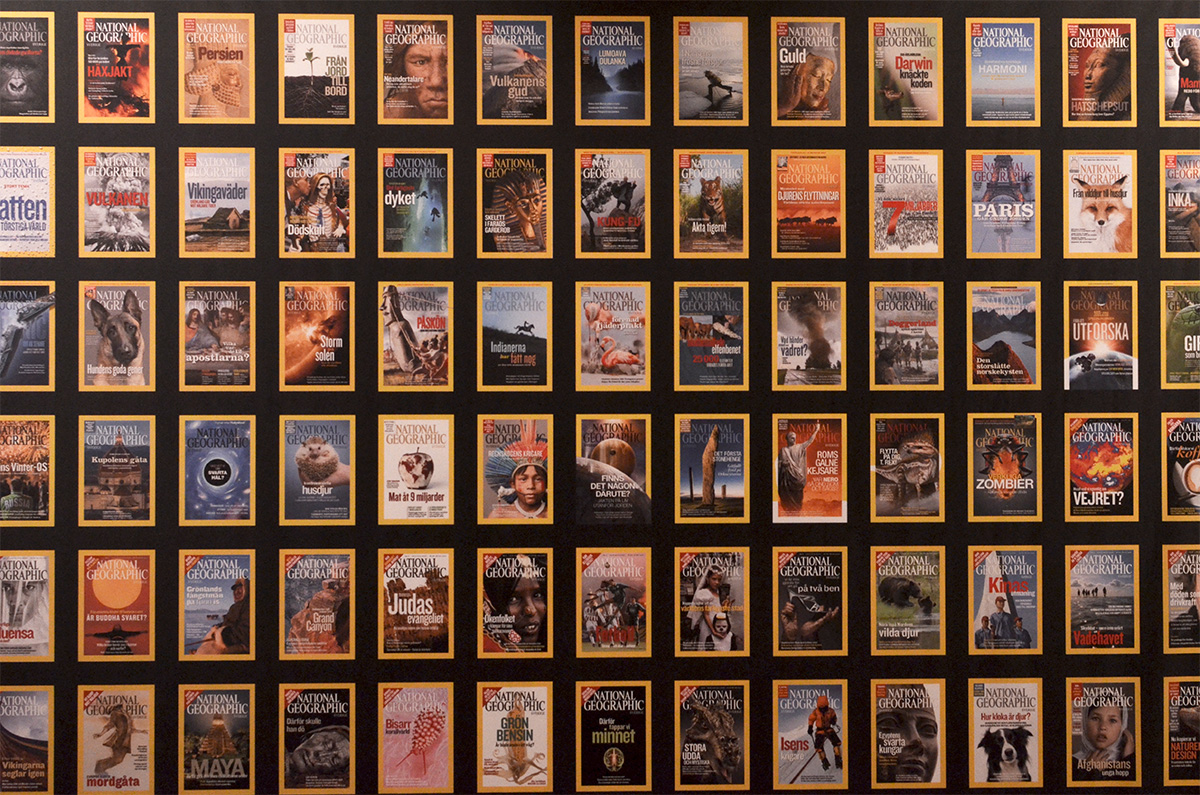 På väg in till utställningshallarna kantas väggarna av magasinens omslagsbilder.