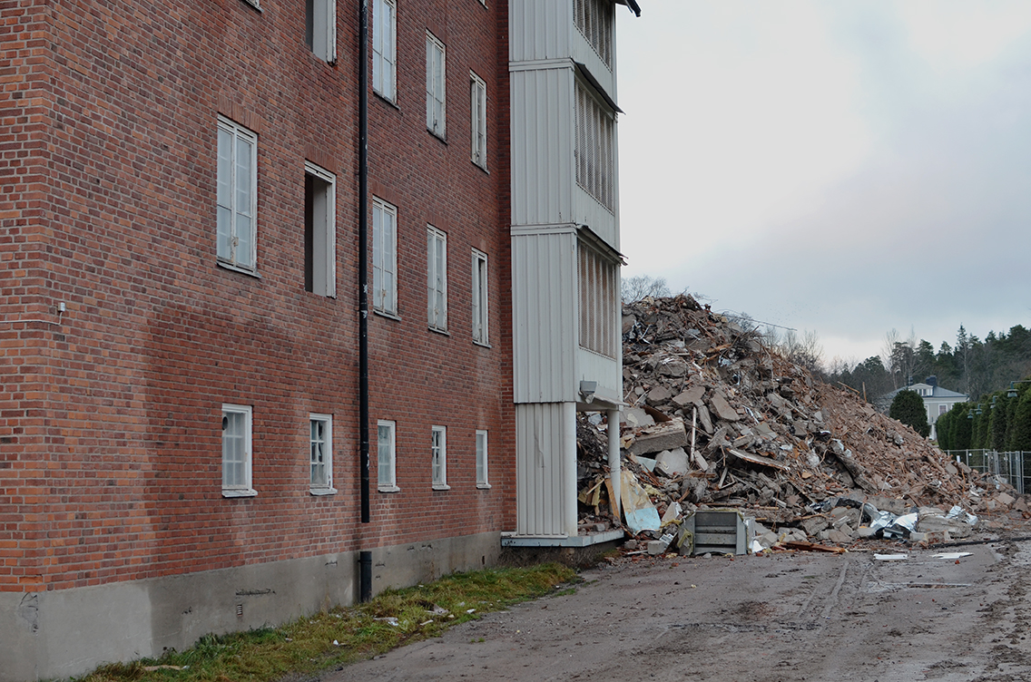 Vet inte varför, men jag blev överrumplad och det kändes lite sorgligt att se den halva huskroppen ligga där i ruiner. Huset har ju alltid stått här! Ja, under hela mitt liv och mer där till i varje fall. Rättpsyk-huset byggdes 1949 och redan 1887 öppnades Mariebergs Hospital som det hette på den tiden.