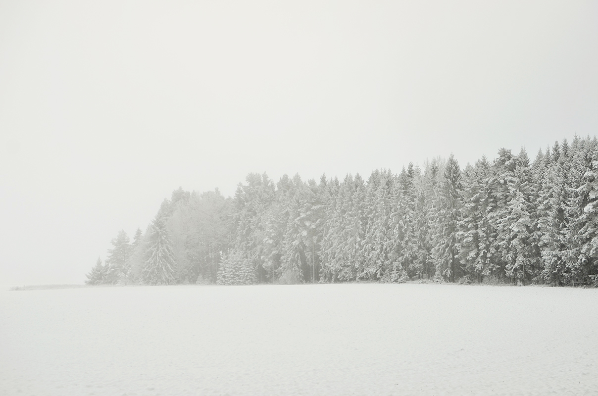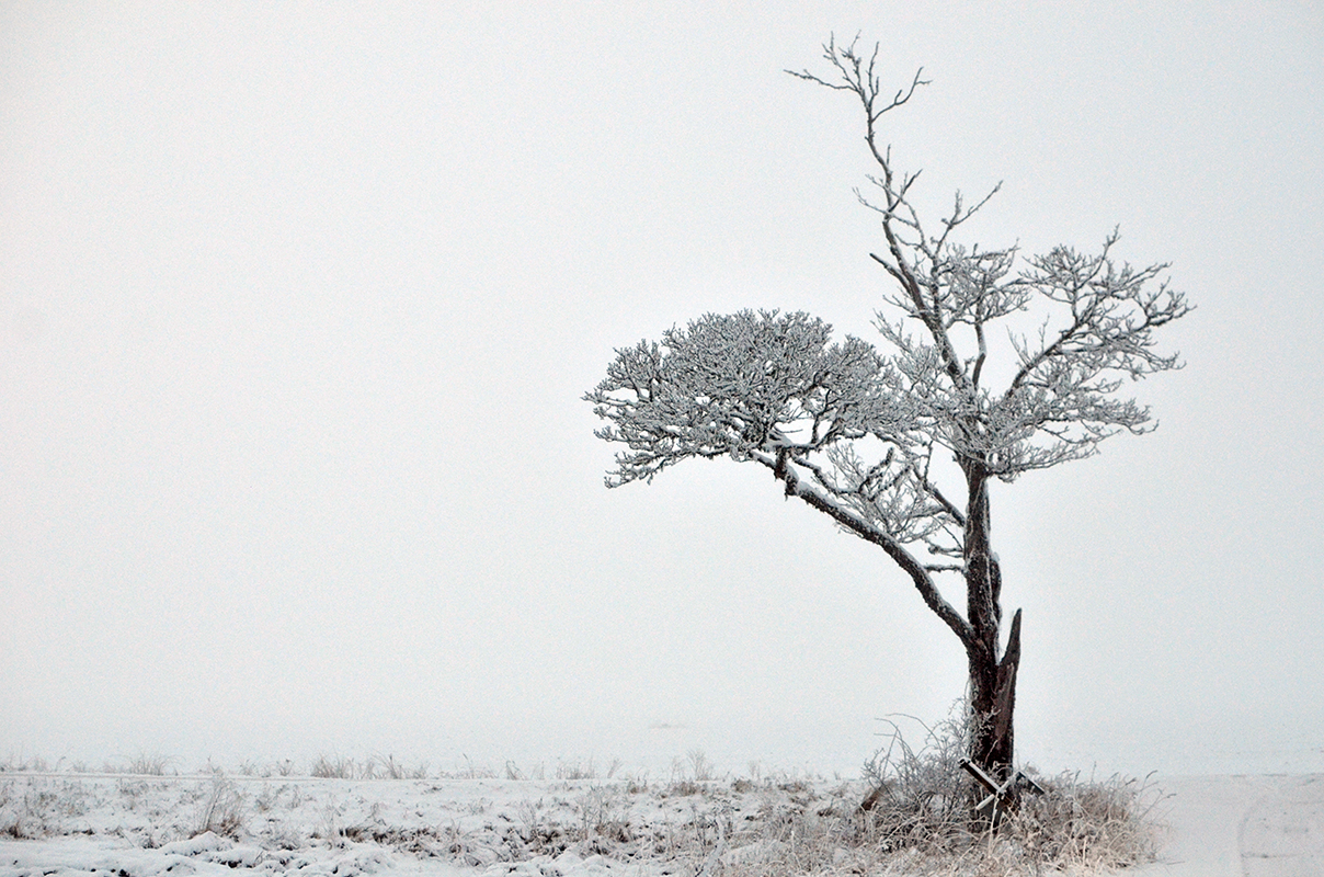 Landskapet är ljudlöst vackert när allt det vita tonar in och ut i luft, mark och himmel utan kontraster i en känsla av oändlighet.