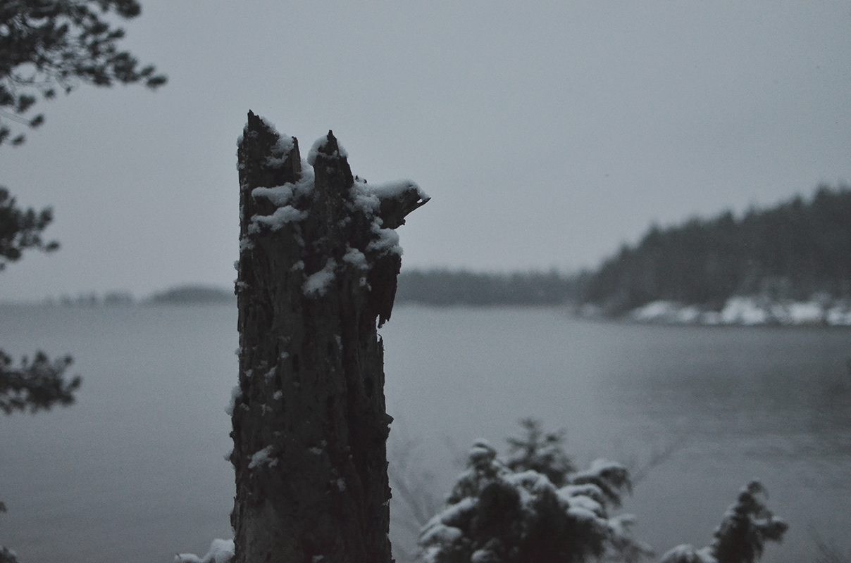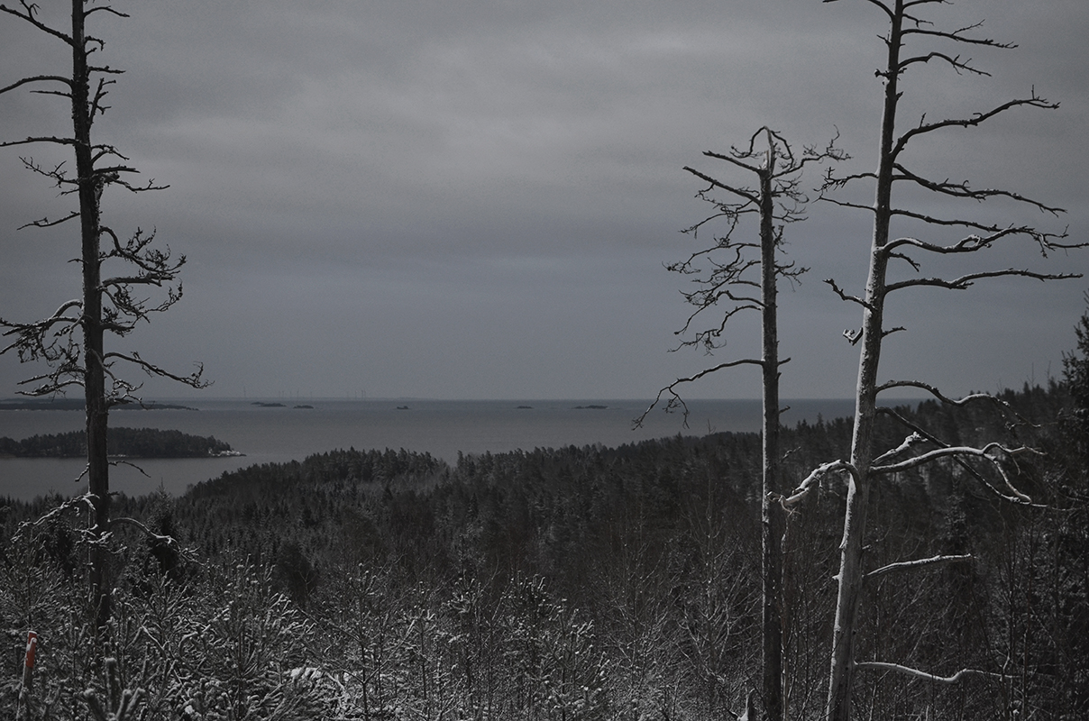 Står på toppen av Kycklingledens högsta punkt i ”den döda skogen” och ser ut över Vänern.
