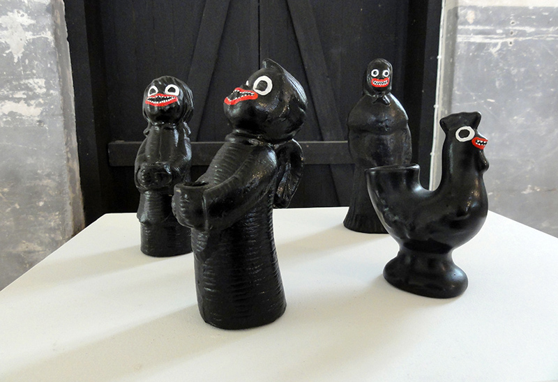 Oväntat och överraskande står jag framför svartmålade prydnadsföremål med stora leende röda munnar som har hög igenkänningsfaktor signerat Makode Linde (du vet han med den levande och skrikande black-face tårtan på Moderna Museet!)