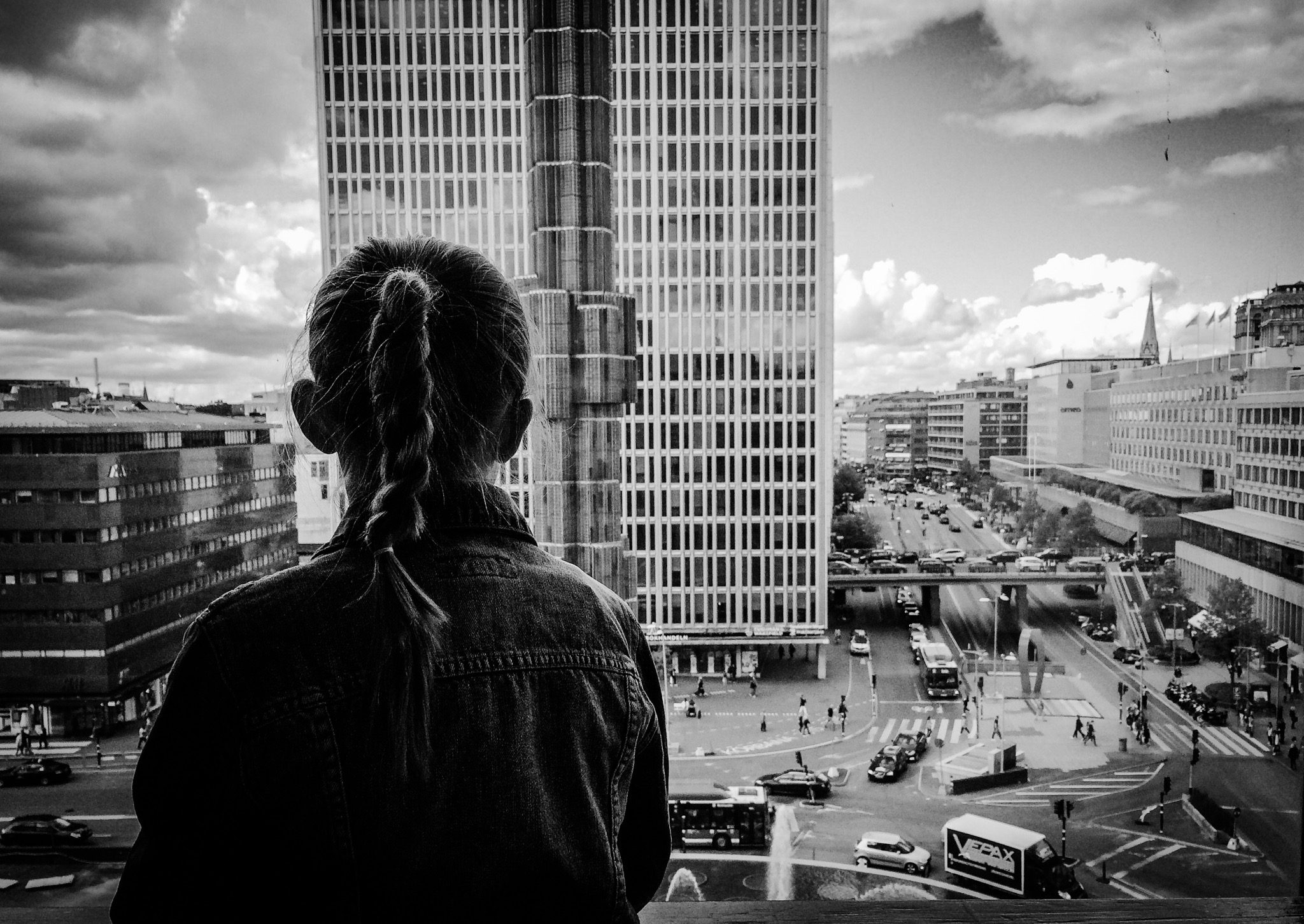 Jag står några våningar upp i Kulturhuset och blickar ut över Sergels torg, mitt emot mig har jag ”de fem trumpetstötarna”.